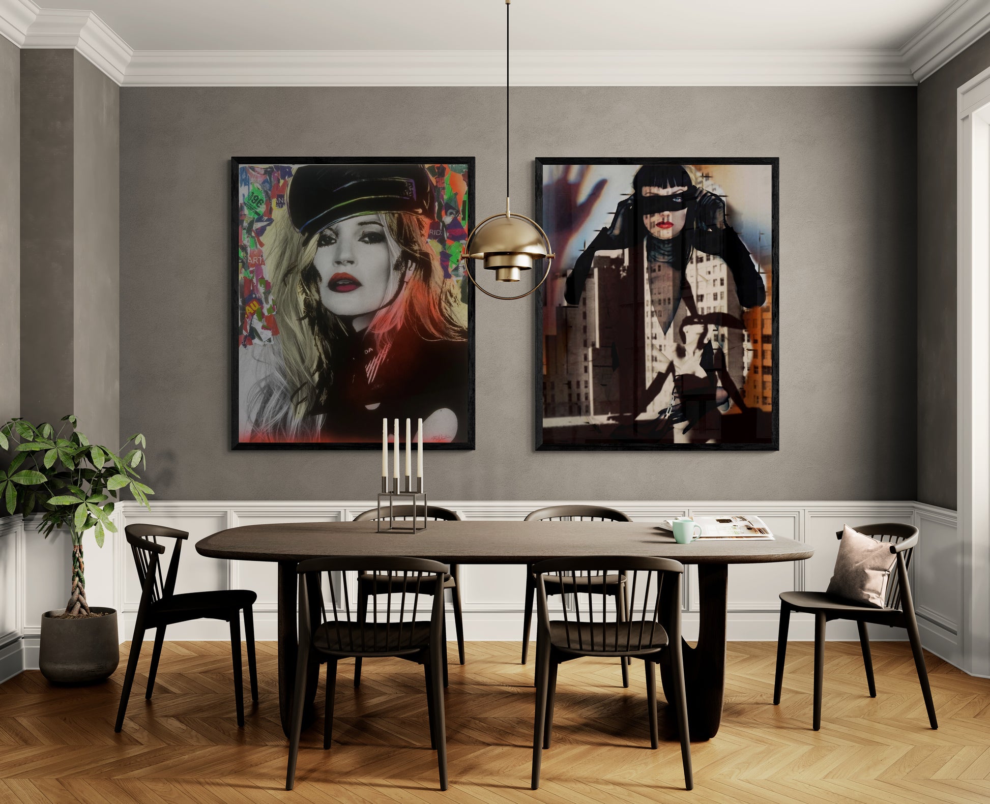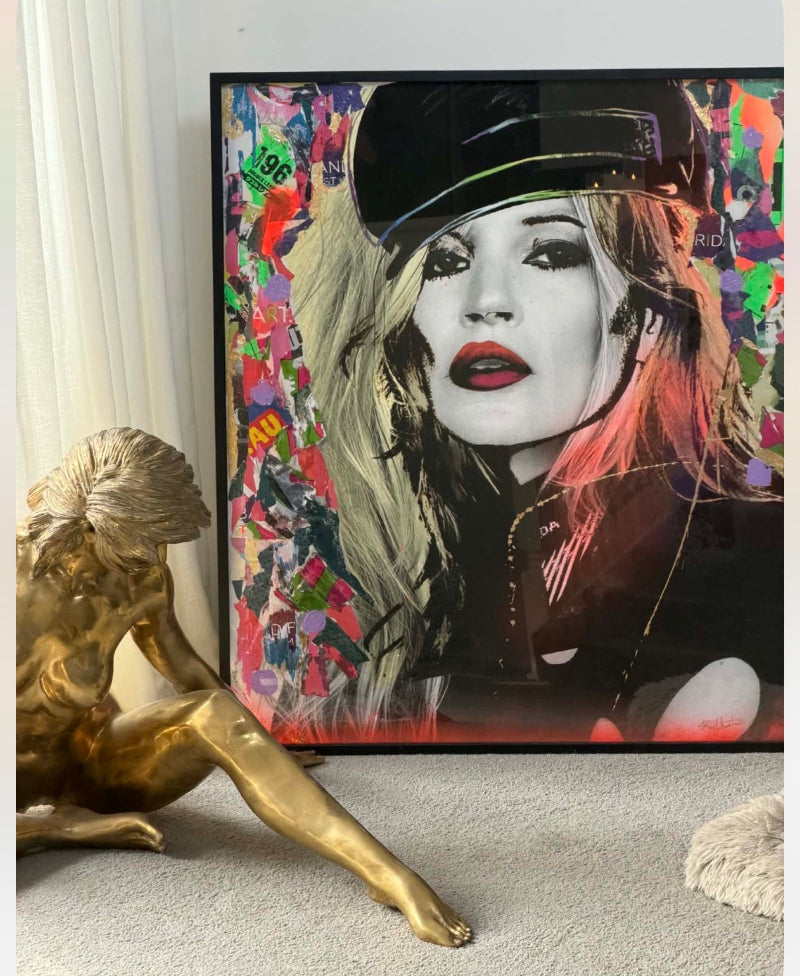 My take on Warhol with Kate Moss,. All the mixed media background are music posters taken from the streets of Melbourne, mixed with graffiti. This piece is a rock homage to Melbourne laneways. This is part of my music icons series