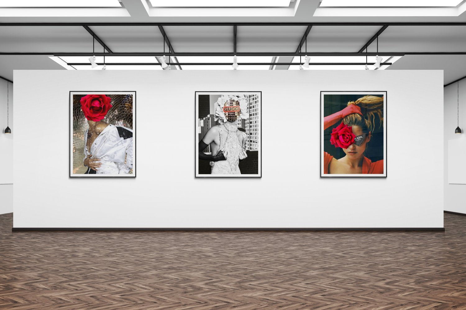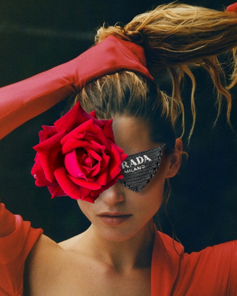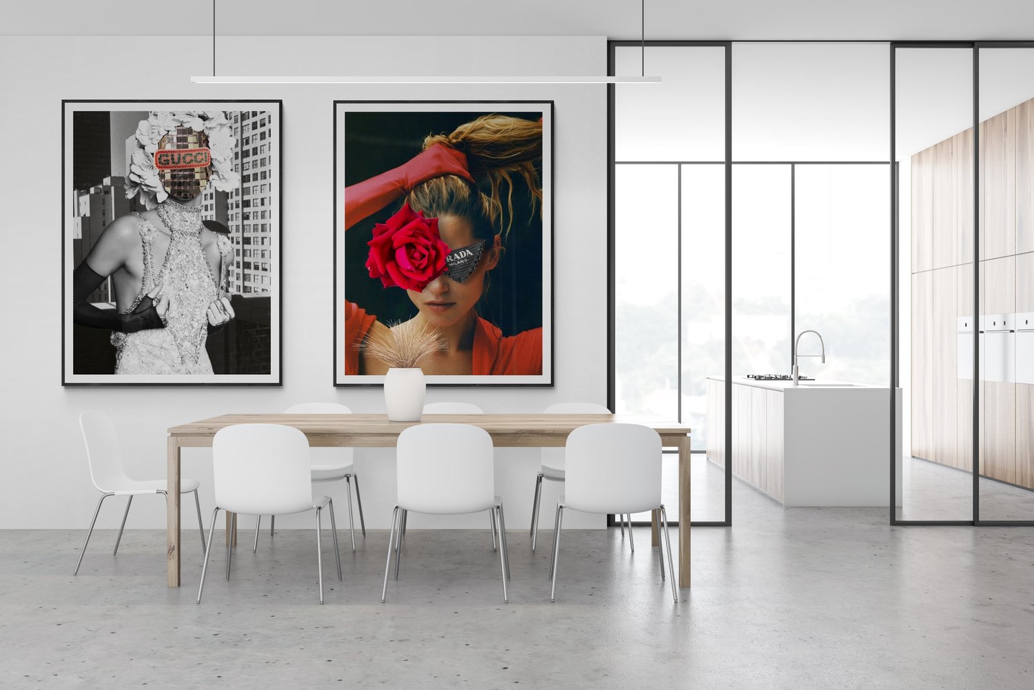 This is an original artwork by Amanda Johnstone using digital collage and layering image from collected fashion magazines photographed by myself for beautiful grainy texture. Original photography of red rose and collage bag logo, Collages multiple elements