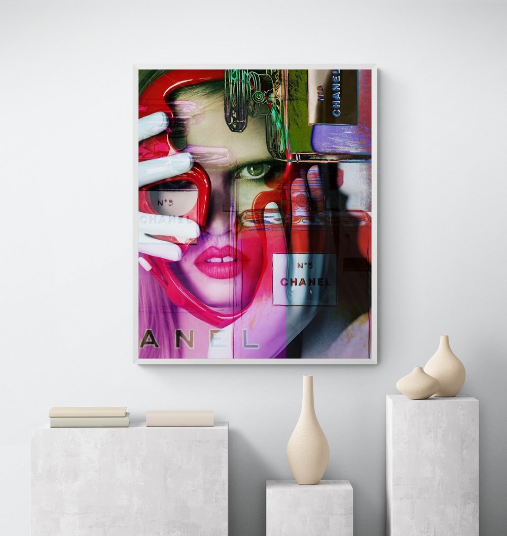 This is an original artwork by Amanda Johnstone using digital collage and layering. Source image unknown from magazine layered with photographs i have taken of Chanel bottles from the Chanel exhibition and original drawings.