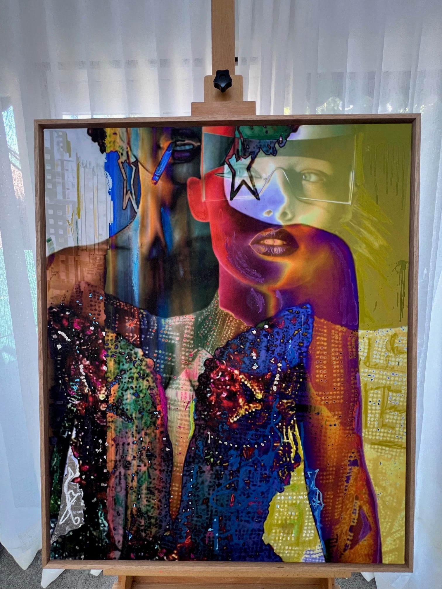 Mixed media by hand applying acrylic paint, silver leaf and resin applied to a giclee’ print on archival canvas