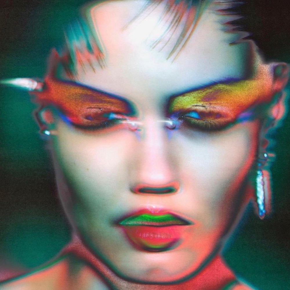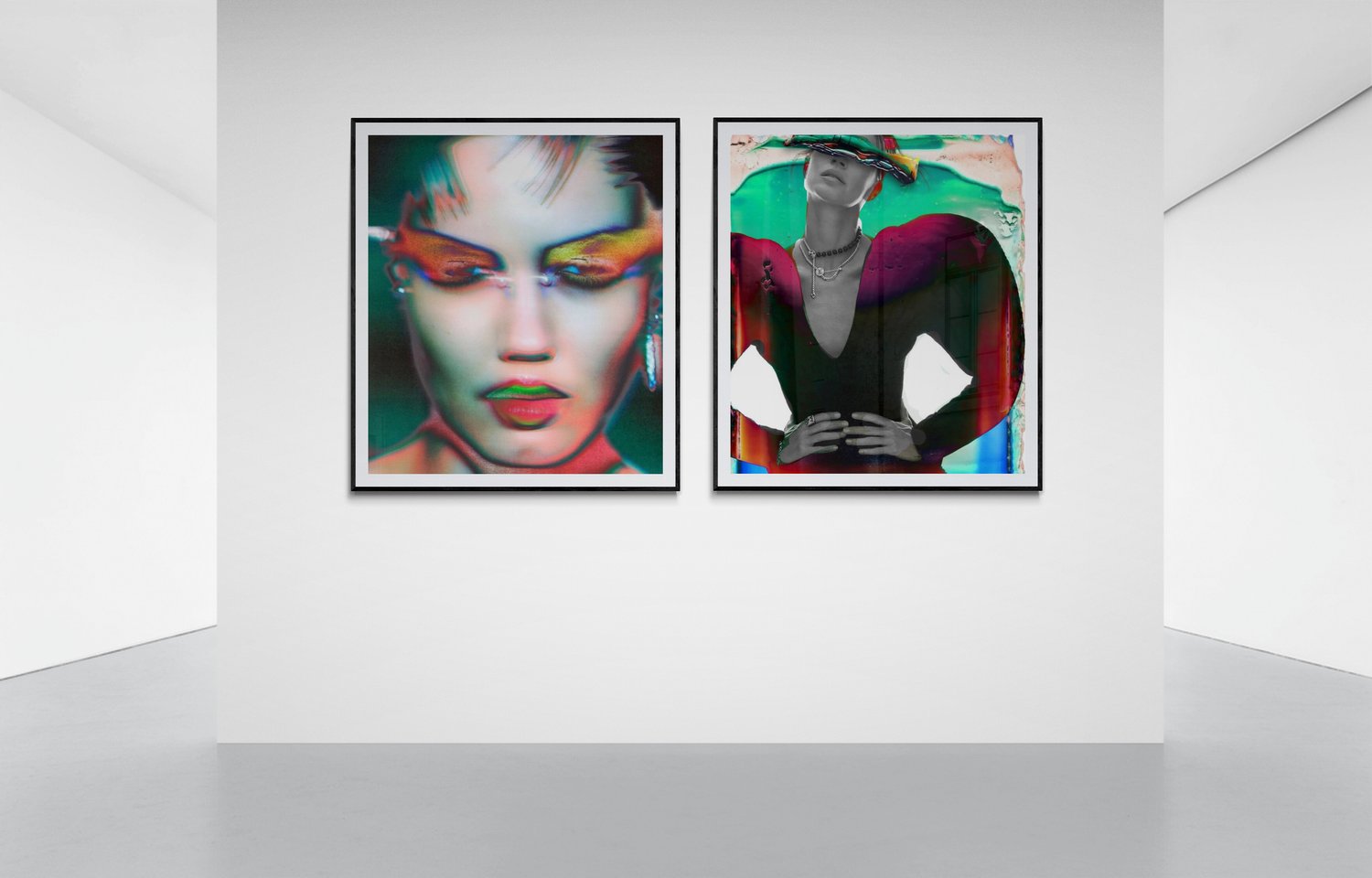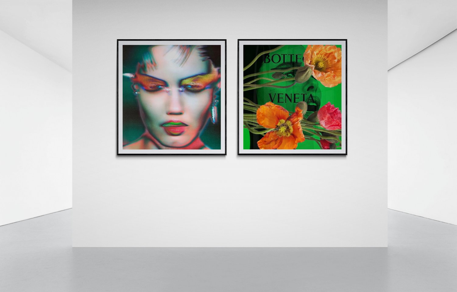 This is an original artwork by Amanda Johnstone using digital collage and layering. Source image unknown from magazine photographed with flower petals., then photographed paint drags on a palette and overlayed.