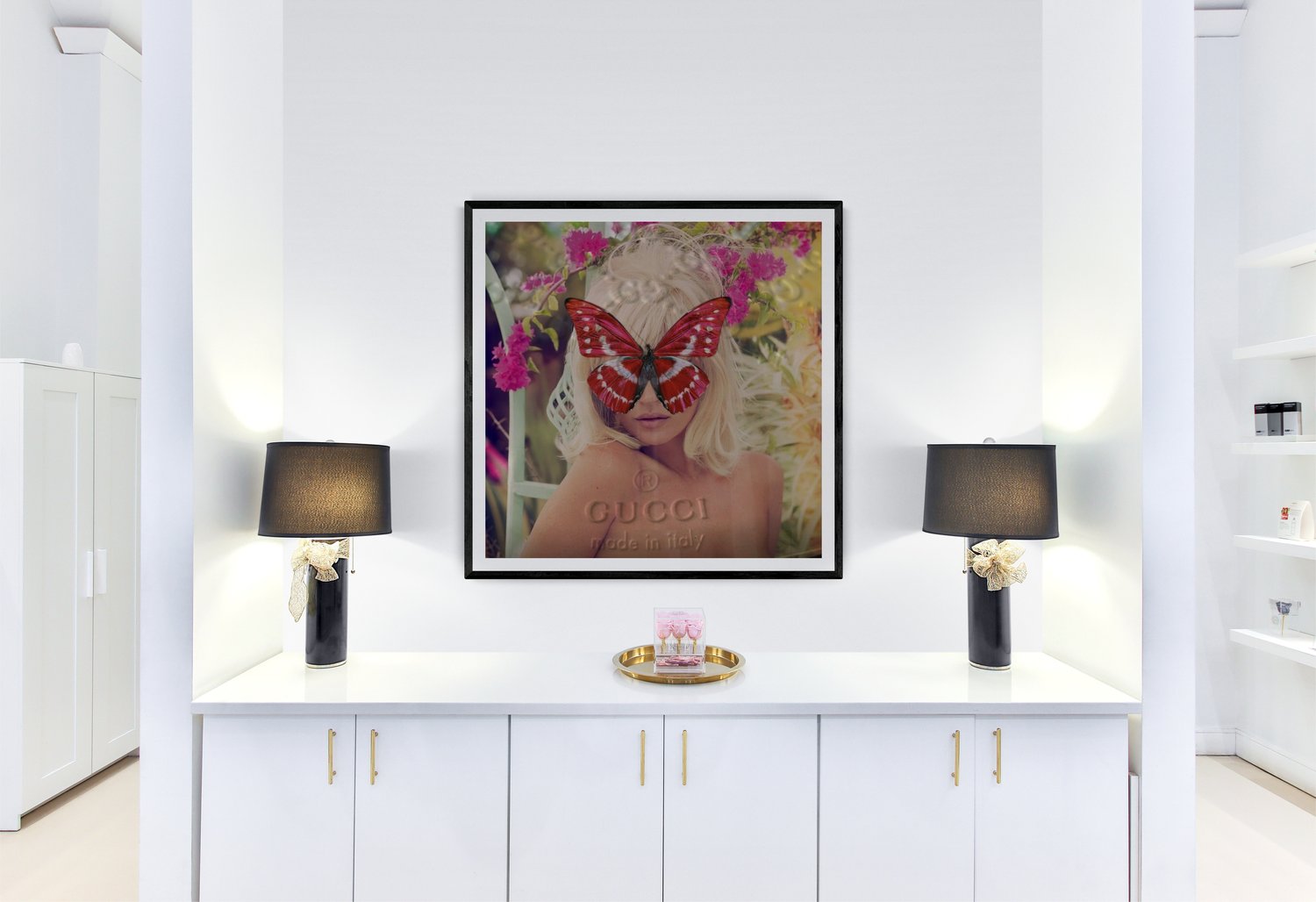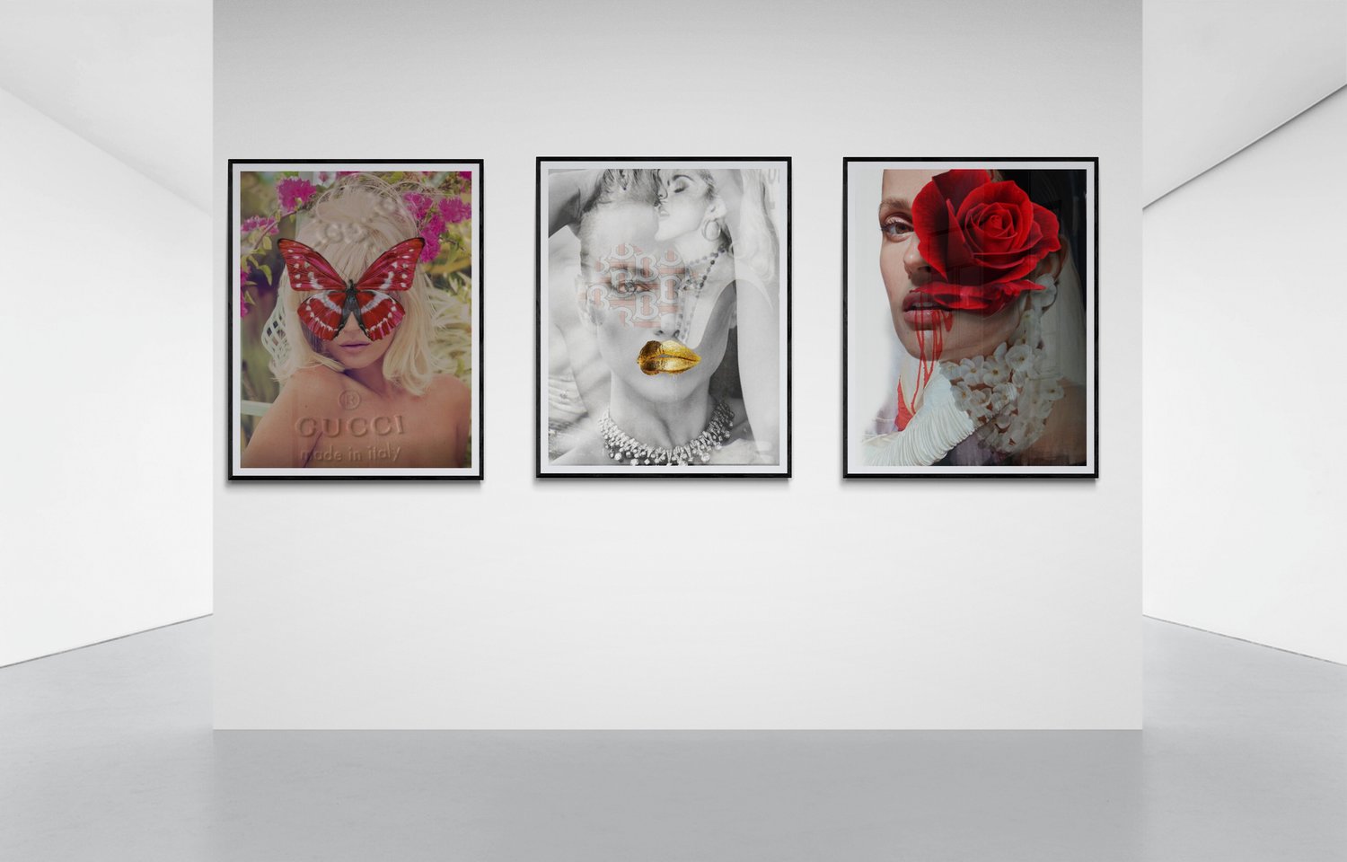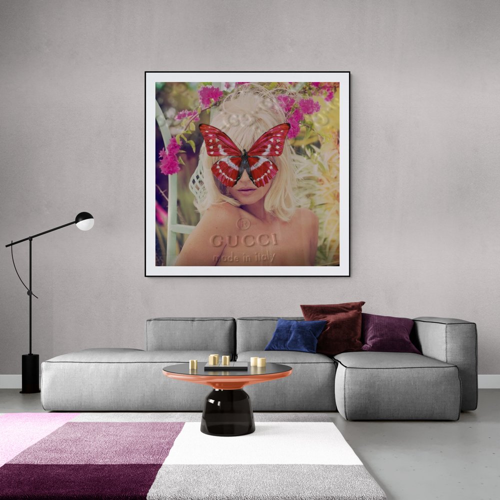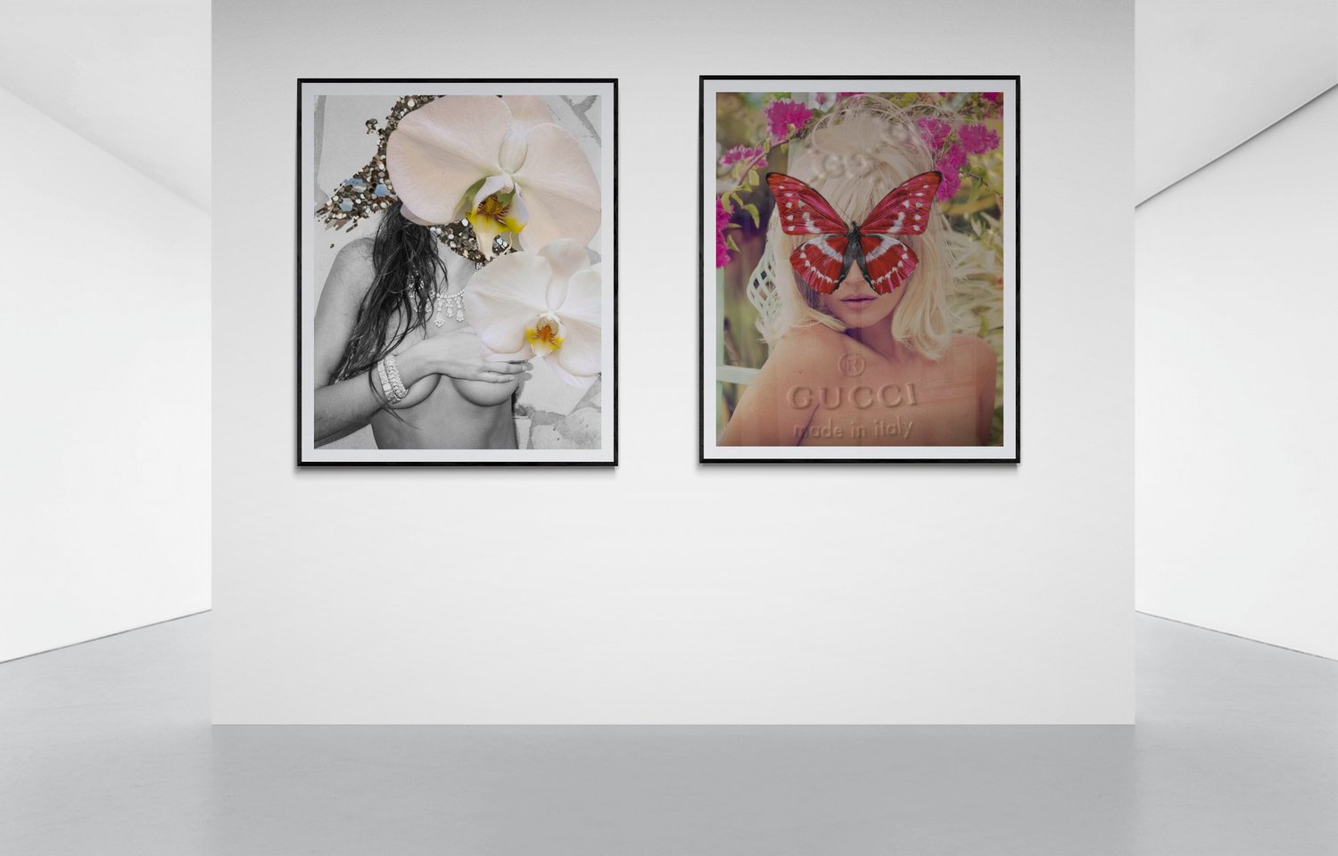 This is an original artwork by Amanda Johnstone using digital collage and layering image from collected fashion magazines photographed by myself for beautiful grainy texture. Collages multiple elements embossed and taxidermy butterfly