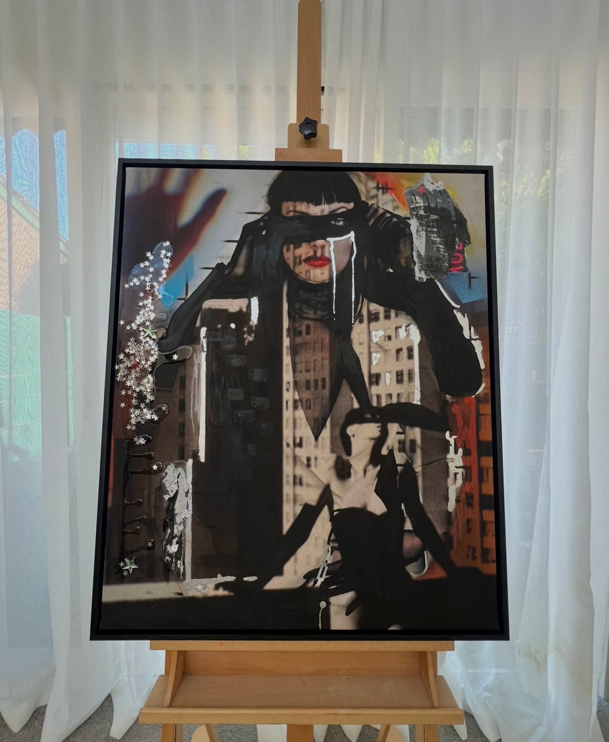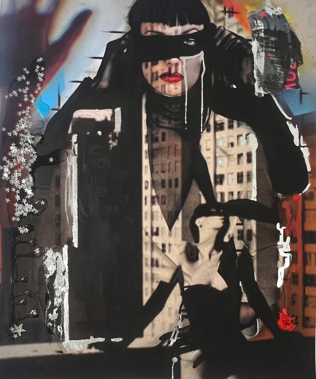 Mixed media by hand applying acrylic spray paint, charcoal, oil sticks, resin, silver leaf and ink applied to a giclee’ print on archival canvas