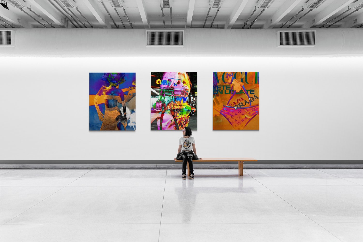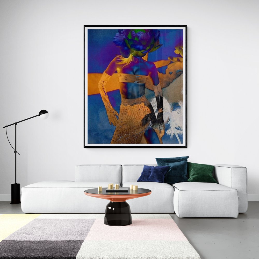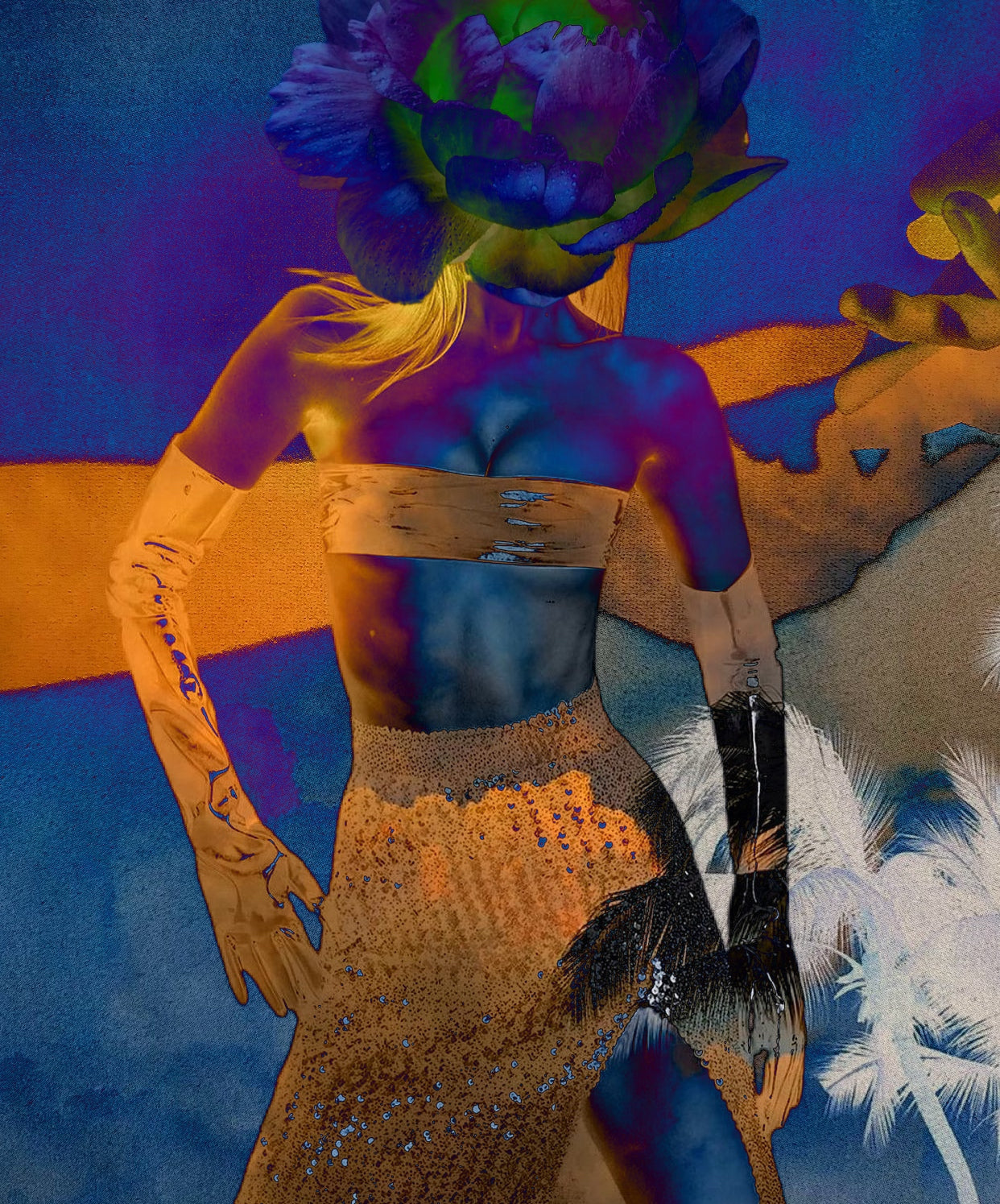 This is an original artwork by Amanda Johnstone using digital collage and layering source image unknown from fashion magazine, background image photograph by Amanda St. Kilda beach.