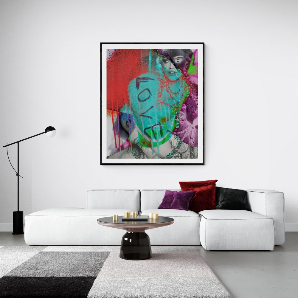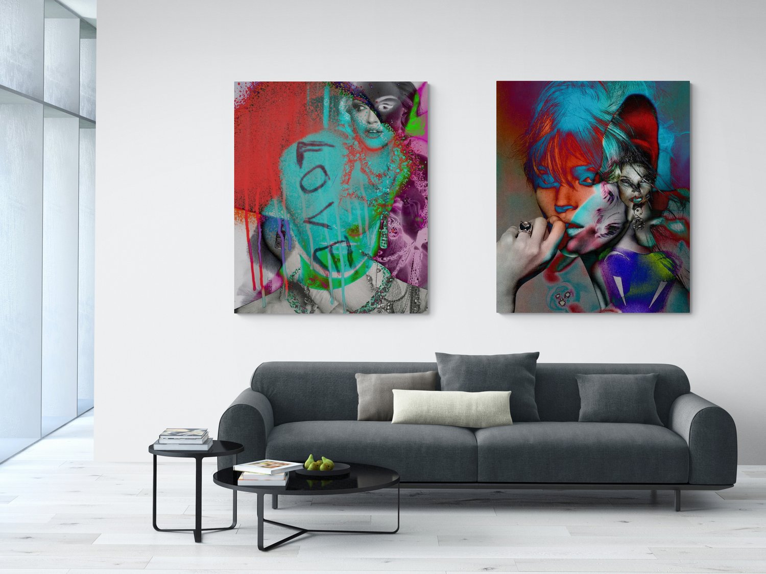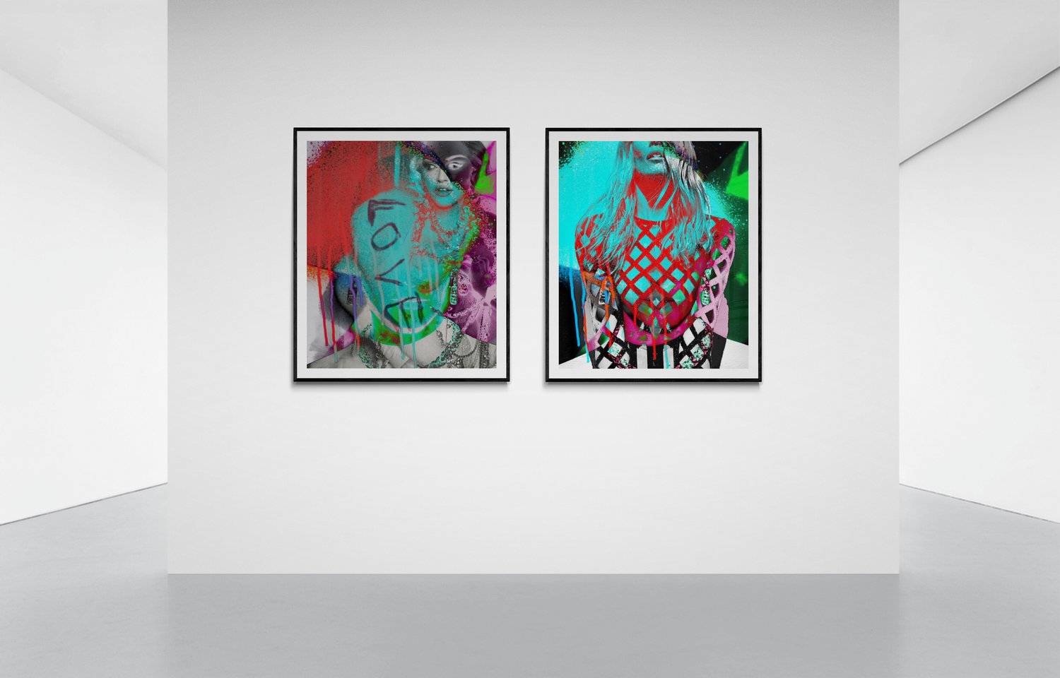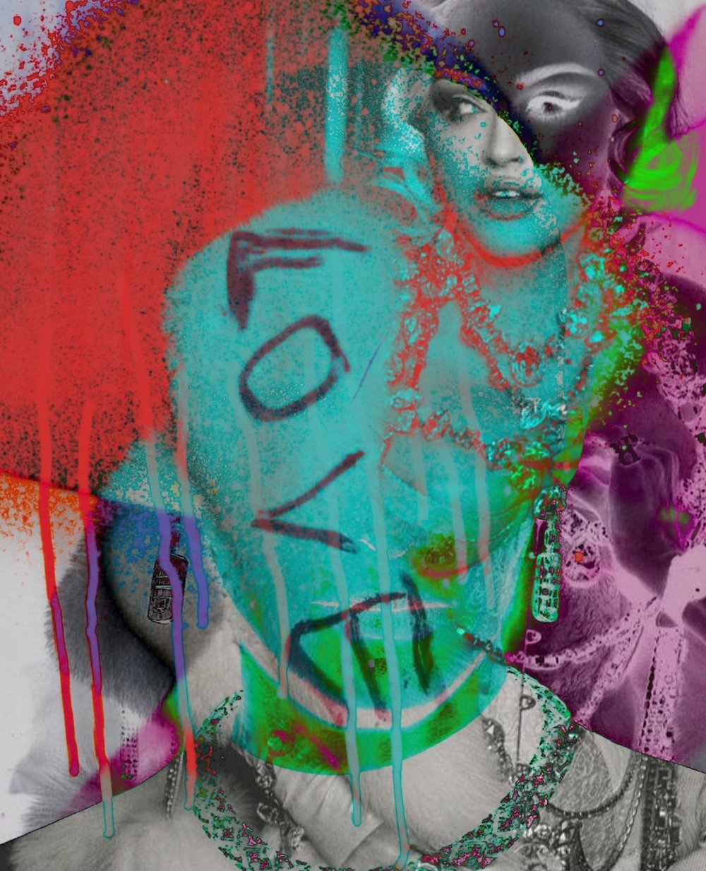 This is an original artwork by Amanda Johnstone using digital collage and layering. Image source V fashion magazine, with hand applied spray paint on paper then digitally layered. Layered models