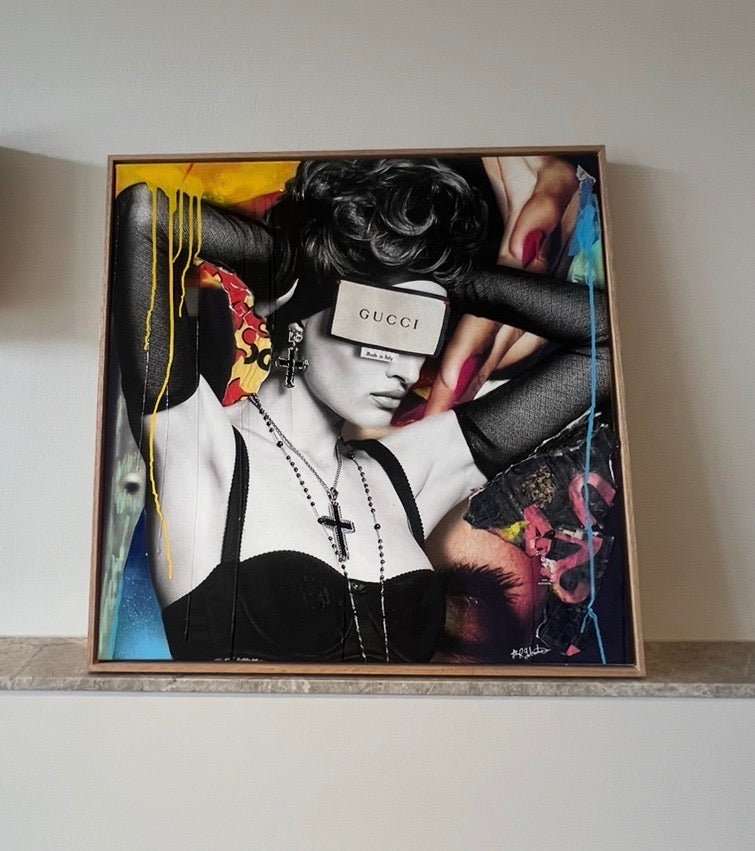 Inspired by the years of creating in my fashion degree, a mix of magazine rip outs, collage, color theory and my favorite error of DOLCE. Large Italian crucifix, modern goth mixed with pop art