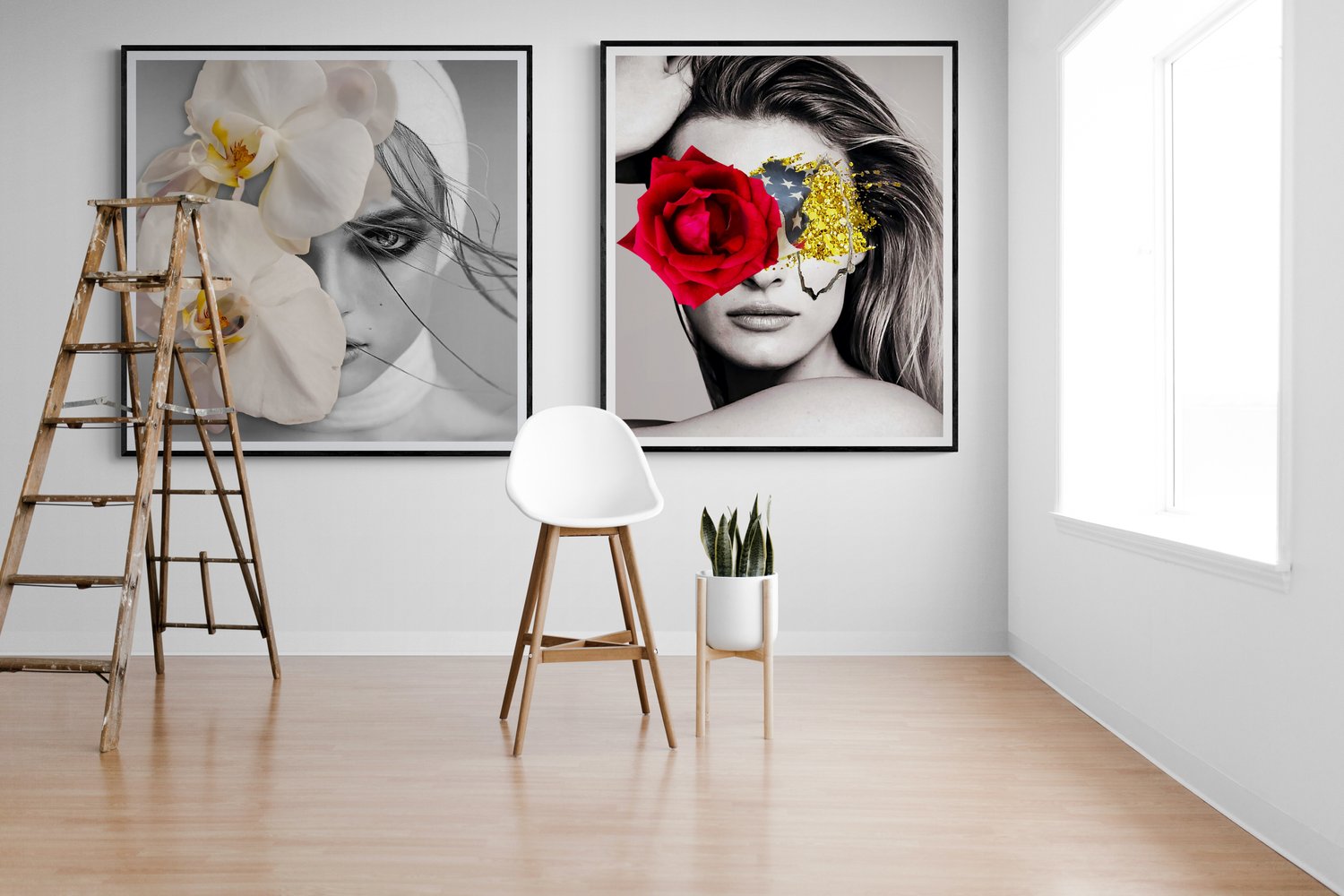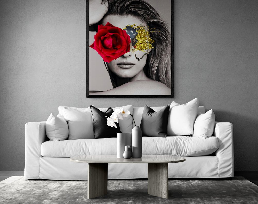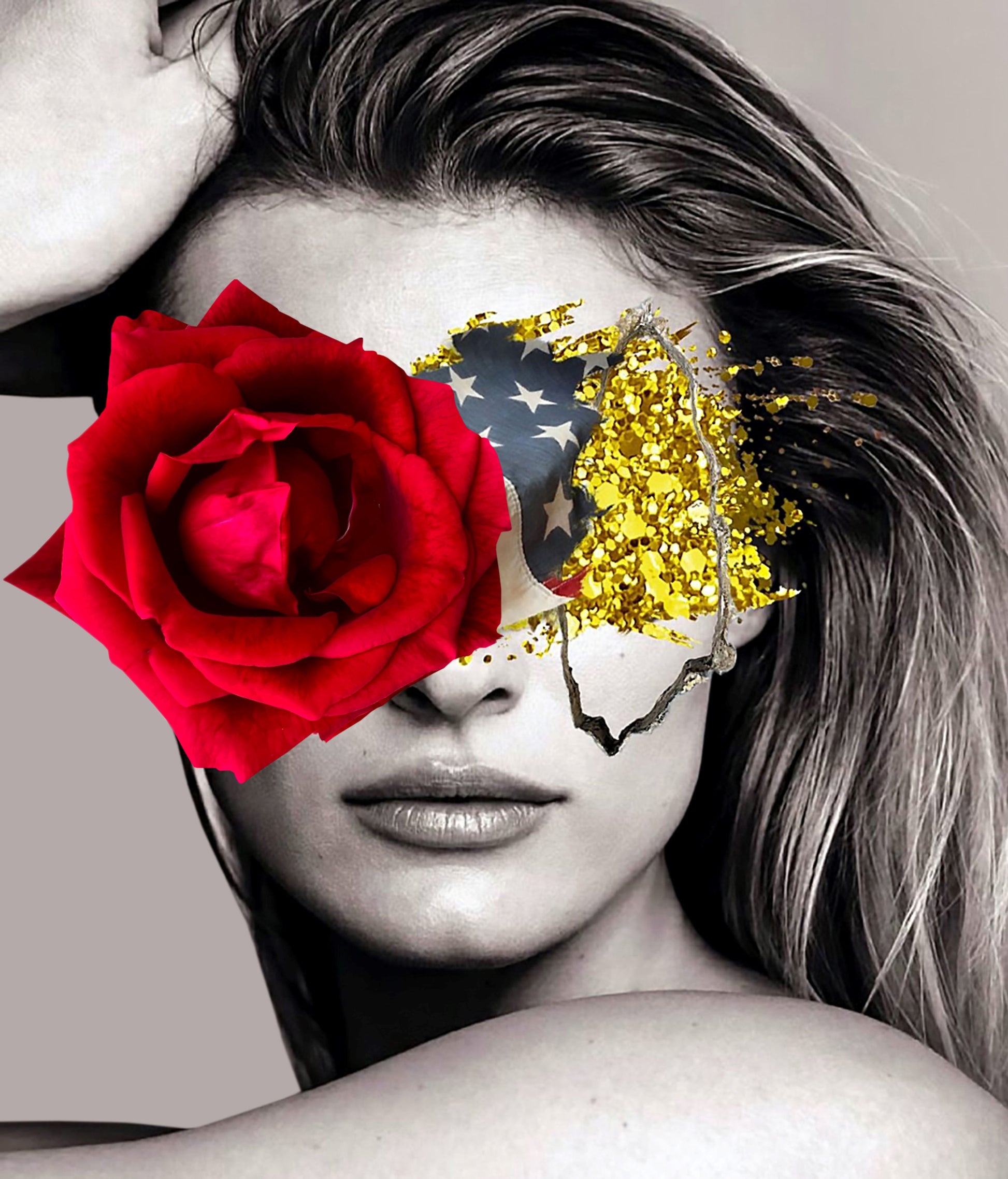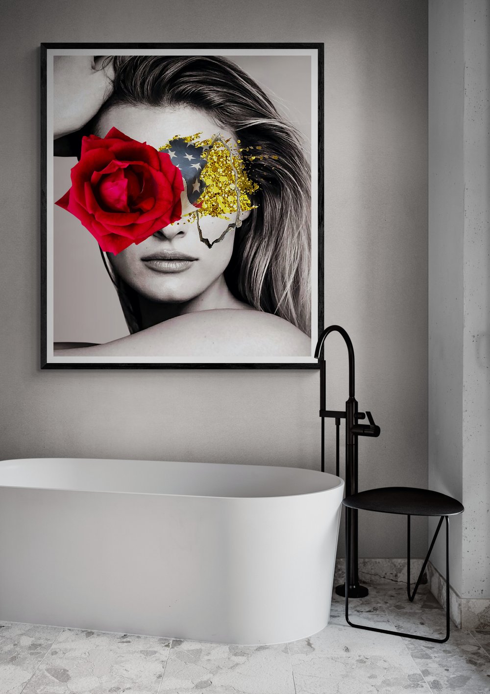 This is an original artwork by Amanda Johnstone using digital collage and layering. Source image unknown, chunky gold glitter photographed by Amanda, Red rose taken from the Botanical gardens, edge cut from mirror. then re-collaged by Amanda Johnstone