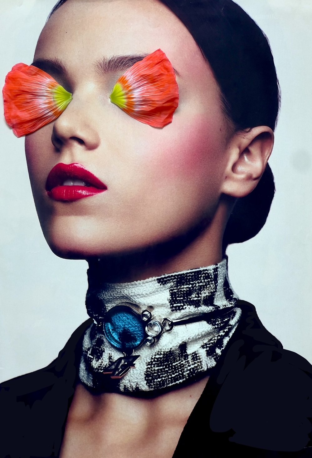 This is an original artwork by Amanda Johnstone using digital collage and layering. Source image unknown from magazine photography of BOTTEGA VENETTA carry bag, and lips/mouth from another shoot