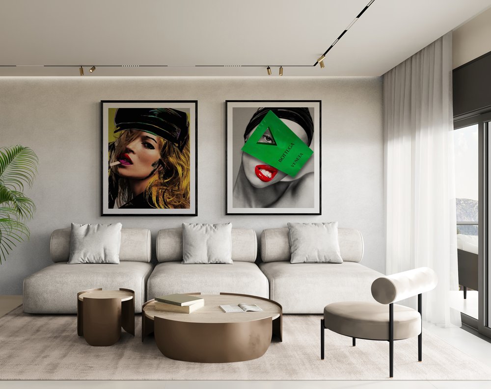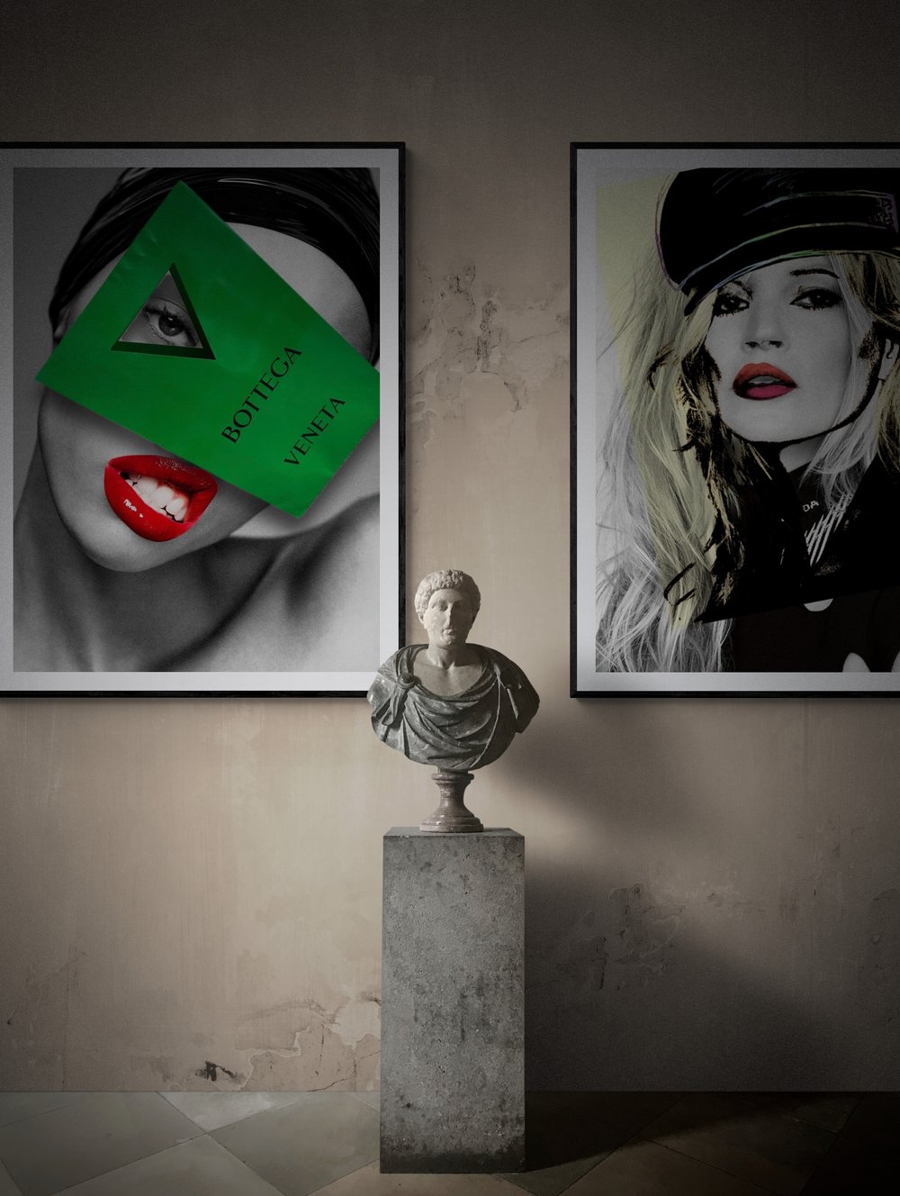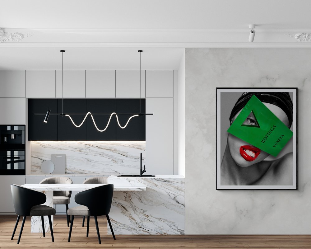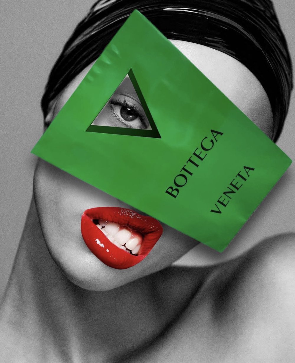 This is an original artwork by Amanda Johnstone using digital collage and layering. Source image unknown from magazine photography of BOTTEGA VENETTA carry bag, and lips/mouth from another shoot